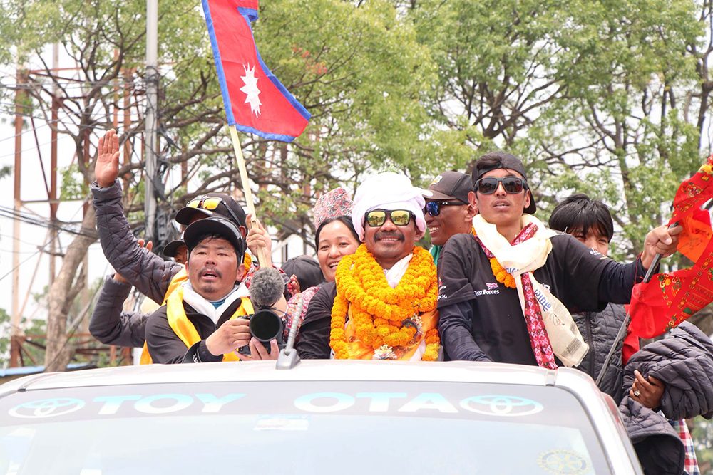 काठमाडौं । सगरमाथा चुचुरो टेकेर आएका पूर्वगोर्खा सैनिक हरि बुढामगरलाई त्रिभुवन विमानस्थलमा भव्य स्वागत गरिएको छ । ब्रिटिश सेनामा रहँदा अफगानिस्तानको लडाइँमा सन् २०१० मा आफ्ना दुवै खुट्टा (घुँडाभन्दा माथि) गुमाएका मगरको सम्मानमा विमानस्थलमा सयौं भेला भएका थिए । वसन्त ऋतुको जारी आरोहणमा बुढामगर यही जेठ ५ गते दिउँसो ३ सगरमाथा शिखरमा पुगेका हुन् । उनको स्वागत तथा सम्मानका लागि पर्यटनमन्त्री सुदन किराँती पनि विमानस्थल पुगेका थिए । मन्त्री किराँतीले दुवै खुट्टा नभएर पनि अदम्य साहस, अथक मिहेनतले विश्व शिखरमा सफल आरोहण गर्न सफल भएको भन्दै बुढामगरलाई उच्च सम्मान गर्ने बताए ।